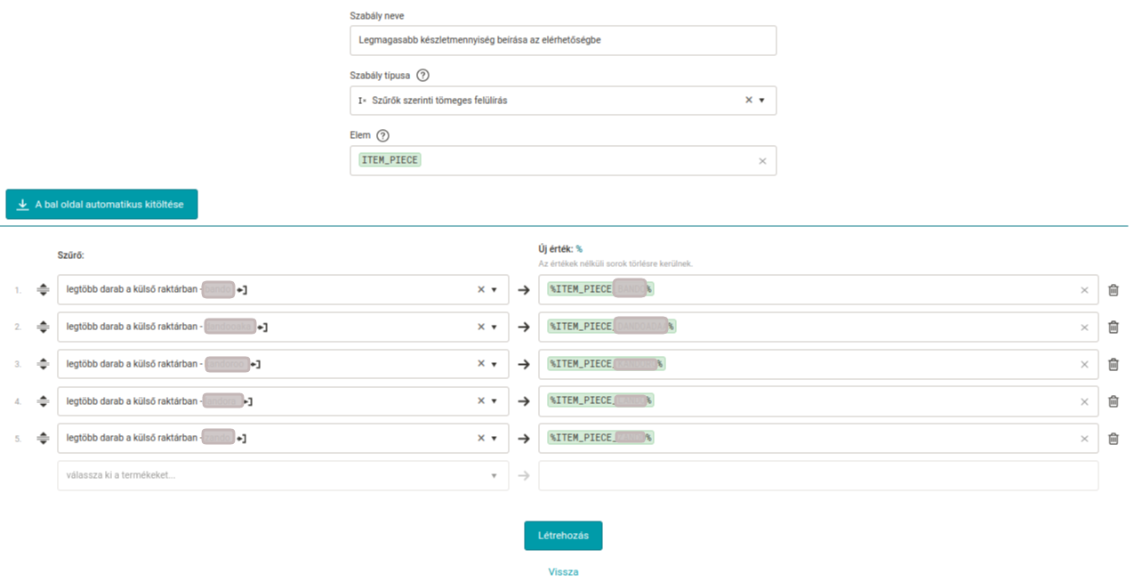 Ezeket szabály segítségével az eljárás elején nullázzuk, hogy minden egyes exportálással az aktuális készlet elérhetőségét írhassuk a feedbe.